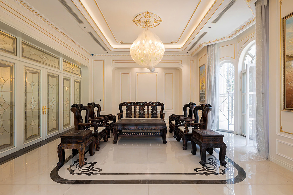 • Phào chỉ và trần thạch cao: Các đường phào chỉ được sử dụng để định hình khu vực tiếp khách và tạo sự đối xứng cho không gian, thể hiện sự trang trọng, uy nghi ngay từ cái nhìn đầu tiên.