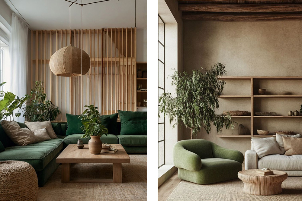 1. Xanh matcha & gỗ tự nhiên (Scandinavian/Wabi-Sabi)